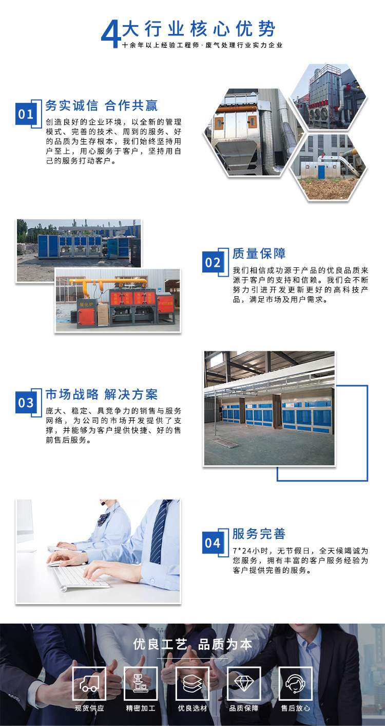公司自成立以來,始終專注于工業(yè)廢氣、污水、粉塵等環(huán)境污染的治理,先后研發(fā)出催化燃燒設備、光氧催化廢氣處理設備、低溫等離子廢氣處理設備、粉塵處理-體化設備等一系列環(huán)保設備,產品先后通過ISO901質量管理體系認證、中國環(huán)境保護產品認證。